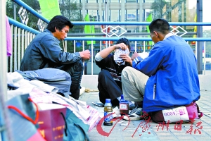 來自黑龍江的老頭其實(shí)不到50歲,雙手有殘疾。他和來自甘肅的小軍已經(jīng)“搭檔”了一年多,關(guān)系最好。聽老頭說,還在北京時,小軍當(dāng)保安,他燒鍋爐,兩人就冒充過便衣警察和嫖客,到酒吧里抓小姐,“弄”到了好幾個包。后來活做膩了,兩人開始流浪,結(jié)伴南下。從北京到廣州,一路風(fēng)餐露宿,足足走了半年才到。最后選定了人民北天橋這個據(jù)點(diǎn)。