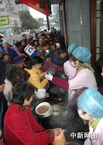 杭州河坊街的施粥情況也有過之而無(wú)不及。據(jù)了解,包括方回春堂在內(nèi)的幾家老字號(hào)都集中在臘八這一天向杭州市民免費(fèi)派送臘八粥!盀榱四軌蛟谂D八這一天盡早喝到臘八粥,我們幾個(gè)老兄弟從昨天晚上12點(diǎn)不到就守在這里了,可是沒想到竟然還有人比我們?cè)!币呀?jīng)喝到熱騰騰的臘八粥的王大爺興奮地說。記者在現(xiàn)場(chǎng)看到,等候施粥的市民隊(duì)伍從方回春堂出口出發(fā),一直延伸到了吳山廣場(chǎng),占據(jù)了整整一條河坊街。