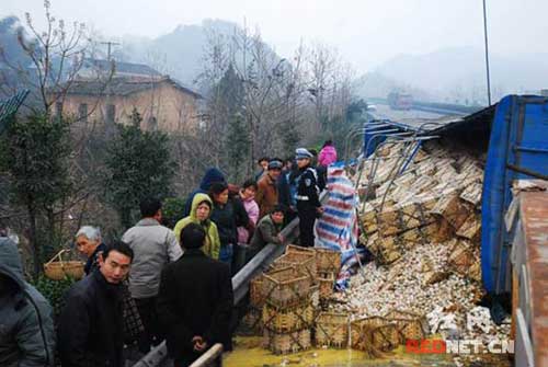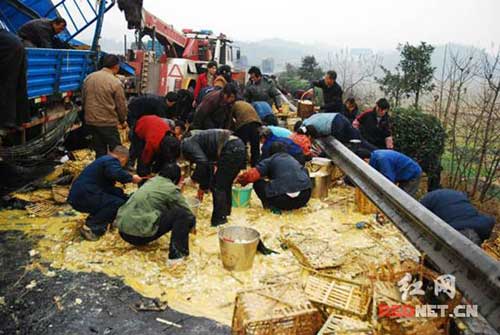 1月4日早晨6時40分,一輛滿載7噸鮮鴨蛋的湖北小貨車,由北往南行駛至京珠高速高速公路長潭段212公里時,因躲避快速車道的一輛汽車超車側翻,10萬多只鴨蛋傾覆在近8米長的高速公路路肩上。附近近百村民聞訊前來哄搶,現(xiàn)場一片狼藉。