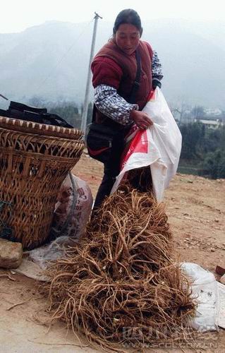 40多歲的魏永珍是任家坪村人,她麻利地將麻袋中還粘著泥土的當歸倒出來任人挑選,以1.5元/斤的價格賣出。這個價格,是去年同期他們賣給下鄉(xiāng)收購“小老板”的批發(fā)價。他們所在的地段,不斷有游客走過,走到北川老縣城外的“新三倒拐”看地震遺址,很多人會停下來買些當歸。屢次來此買過當歸的王師傅說,這里的當歸味道很正,有一種純正的甜味。魏永珍笑嘻嘻地說:“我們這里當歸好,路過的人都來買,生意多好。”一回頭,她指著遠處大面積的山說,地震已讓家園盡毀,原來用于種當歸的地都毀得差不多了:“本來可以產(chǎn)600斤左右,現(xiàn)在就剩了點邊角了,差不多只有100斤左右!