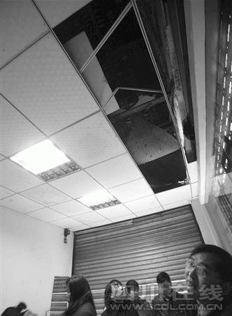 記者看到,店鋪柜臺(tái)上還留有幾個(gè)腳印,腳印上方的天花板,是一個(gè)2米見方的大窟窿,而在“大窟窿”上面,還有垂直相連的另外2個(gè)大洞,透過三個(gè)窟窿,可以直接看到房頂外面的天空。
