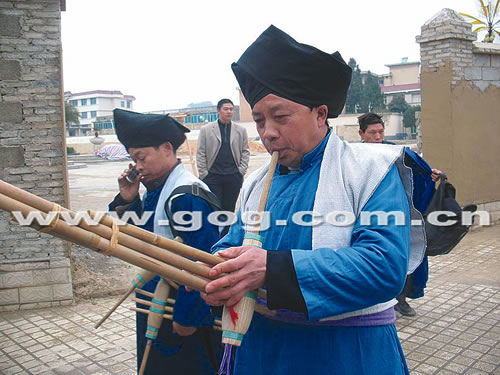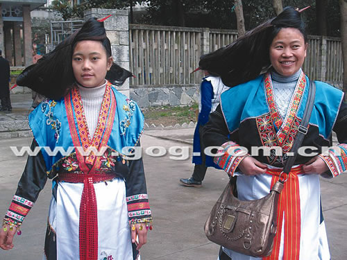 記者看見(jiàn),穿戴盛裝的男子們均身穿青藍(lán)色的長(zhǎng)衫,外加一件白色的小褂。據(jù)稱(chēng),這件小褂名為旗幟褂,上面還繡有夜郎王印,穿戴旗幟褂,這與祖先們打仗有關(guān),他們頭上戴的用黑布包裹的帽子有五個(gè)角,看上去讓人頓生威嚴(yán)之感(如圖);而夜郎美女們穿戴的是一套漂亮的有各種色調(diào)的衣裙,據(jù)她們說(shuō),這叫七江裙,上面記錄有他們的祖先約3000多年前遷徙的歷史。而最令人注目的,還是這些夜郎美女們的發(fā)型。只見(jiàn)她們的頭上均插了一根約兩尺長(zhǎng)的竹片,長(zhǎng)長(zhǎng)的頭發(fā)繞著竹片使頭發(fā)在右側(cè)成了一個(gè)半弧形(如圖)。她們告訴記者,這種發(fā)型也是竹王崇拜的一種。