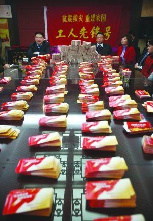 將近三百萬元現(xiàn)金堆在桌子上,看起來有點“夸張”,但它們在即將要送的紅包中,只占現(xiàn)金量的十分之一左右!這次去災(zāi)區(qū),陳光標(biāo)與63位企業(yè)家捐贈與籌集的現(xiàn)金總額約3000萬元,另外還有大米、豬肉、食用油、羽絨服、毛衣等物資,價值3000多萬元。其中,陳光標(biāo)的黃埔再生資源利用有限公司捐贈現(xiàn)金300萬元。