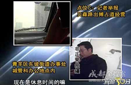 近日,成都電視臺《真相30分》欄目組接到神秘舉報電話。對方舉報城管收取好處費,對出攤占道視而不見。對此,記者專門進(jìn)行了暗訪。成都全搜索網(wǎng)站記者通過影像資料發(fā)現(xiàn),城管執(zhí)法人員不僅有對出攤占道經(jīng)營故意睜一只眼閉一只眼的嫌疑,還暴露了城管管理缺失的問題。