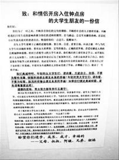 原公開信就貼在南京仙林大學(xué)城文苑路某高檔小區(qū)門口,信中告誡大學(xué)生不要“為了一時之歡,不顧養(yǎng)你們的親人的期盼,不顧給社會人才的榜樣形象,不顧給我們?nèi)粘I畹挠绊懀诰用裥^(qū)內(nèi)成雙成對地進(jìn)出……”公開信還提醒提供日租房的小區(qū)業(yè)主“不要為蠅頭小利替他們愚蠢的沖動提供溫床了!”信件的落款是“盼望你們進(jìn)步、成長、成才、幸福的父母、叔叔、阿姨、兄弟、姐妹!