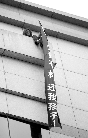 記者看到,一名身穿紅色外套的年輕女子,正坐在樓頂外墻伸出的一小塊天臺邊緣,垂著頭發(fā),兩腳懸空,一只手抓著手機,另一只手拉著一條條幅,上面寫著“還我孩子”等幾個白色大字。圍觀的人越來越多,記者回頭望去,只見淮海路一側(cè)的自行車道上,整片黑壓壓的腦袋。
