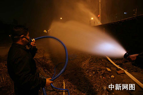 晚上七時許,記者趕到事故現(xiàn)場,空氣中彌漫著難聞的煤氣味。為防止意外,泄漏點江北大道前后500米已被交警部門拉起長長的警戒帶。由于封道,警戒線外汽車排起了長龍,一眼看不到底,圍觀者眾多,整條環(huán)城北路幾乎癱瘓,十幾名交警正在現(xiàn)場指揮疏散。而在警戒帶內(nèi)200米,消防部門正在下風(fēng)方向設(shè)置了三道水幕水帶,對泄漏的煤氣進行稀釋。