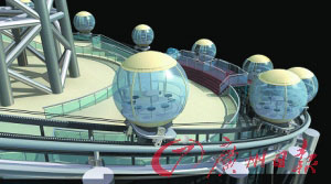 每個觀光球艙直徑3.2米,可“裝”4~6名乘客;球艙殼體采用新型高分子材料,晶瑩剔透,能保證艙內(nèi)游客對塔外景色一覽無余。