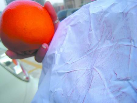 昨日下午,記者來(lái)到東韓寨,在一個(gè)攤位上買(mǎi)了4個(gè)顏色看起來(lái)偏紅的橙子。用白紙擦拭,果然發(fā)現(xiàn)白紙被染成粉紅色。記者詢(xún)問(wèn)原因,商販稱(chēng)在皮上涂了一些食用色素,“沒(méi)事,大家都這么涂的”。