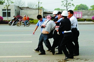 據(jù)陳勇介紹,昨日下午4時,他正在中南大學新址的拆遷現(xiàn)場采訪。當時,有拆遷戶拉著橫幅,與數(shù)十名身著城管和聯(lián)防制服的男子對峙!皠傞_始還算平靜”,不多時,五六名穿制服者圍毆一名拆遷戶。