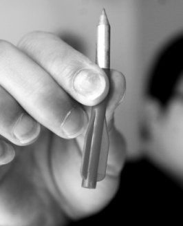 木板墻上留下很多洞孔,有類似釘子釘穿的痕跡。公司工作人員證實(shí),這些都是歹徒用弩射擊的彈痕。記者看到,“子彈”是由3公分左右長的尖鋼釘和3公分左右長的螺旋狀紅色塑料連接而成。