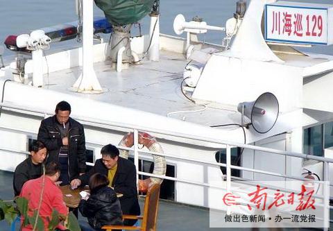 3月25日,記者在四川新聞網(wǎng)麻辣社區(qū)里看到,有關(guān)南充市地方海事局工作人員上班時(shí)間在海事船上打牌的圖片格外引人注目。網(wǎng)友稱其為“嘉陵江上最‘!未薄S浾咴诰W(wǎng)上看到,一艘標(biāo)有“中國海事”字樣的船,停泊嘉陵江三橋附近,緊挨此船停泊的是一艘“川海巡129”執(zhí)法船。