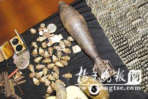 為什么如此熱衷于征集侵華日軍遺物?聽了張廣勝的自述,記者才知道原來他的外公就是在抗日戰(zhàn)爭中被日軍將雙眼弄瞎的!靶〉臅r候我常聽身邊的老人們講故事,講到日本侵略者的暴行,在我心里留下了深深的烙印。后來工作了,有一次下鄉(xiāng),我還記得那是1998年,偶然在一個山村里見到一個放羊人,他將頭羊拴在地上吃草,而我驚訝地發(fā)現(xiàn),他用來拴頭羊的那根鐵桿竟然是日本二戰(zhàn)時最常用的三棱式刺刀。這使我一下子想起許多童年聽到的故事,我覺得有必要把這個刺刀帶回去給大家看看,從這開始我經(jīng)常利用業(yè)余時間上山下鄉(xiāng),去尋找當年日軍在東三省留下的遺物!
