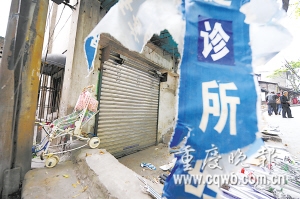 昨日,記者在現(xiàn)場(chǎng)看到,王氏診所位于前驅(qū)路公路邊一棟民房的底樓。診所卷簾門(mén)緊閉,在一張撕得零碎不堪的藍(lán)色布條上,寫(xiě)著“王氏按摩診所”、“推拿、按摩”等字樣。