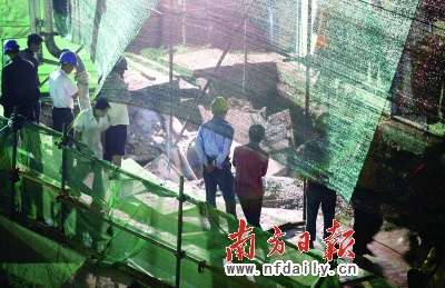 記者昨晚9時40分離開現(xiàn)場時,有關部門的工作人員正在用儀器勘測。目前,事故原因仍在進一步調查中。(記者/張鵬)