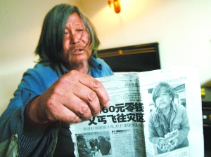 依舊是那身滿是補丁的藍(lán)布衣、依舊是那頭凌亂的花白發(fā)、依舊是那張樸實而蒼老的臉,住在北京海淀區(qū)某招待所里的徐超還是一年前的模樣,只是頭發(fā)很久沒理,已經(jīng)齊肩。徐超所有的行李不過是一個癟癟的深藍(lán)色布袋,里面除了一捧前幾日討來的鋼镚,就只有一沓用塑料袋精心包裹著的報紙。
