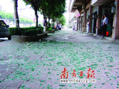 昨日,記者再次來到事發(fā)地看到,警方仍未解除警戒線,幾名民警在現(xiàn)場緊張勘察。事發(fā)街道兩旁的玻璃碎片仍是灑落一地,離爆炸核心位置20多米遠的一家修理店老板介紹,很多玻璃碎片都是從對面街道飛過來的,他指著一塊插入卷閘門的石頭說:“這個也是從對面飛過來的,當時爆炸的威力太可怕了!
