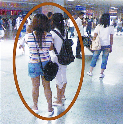 7月2日早晨6時許,記者再次來到出站口,不到十分鐘發(fā)現“目標”:一個穿吊帶衫、熱褲的女孩。她皮膚白凈,又高又瘦,挎單肩藍色包,略施脂粉。不同于其他接站市民的是,她不看出站人群,不關注到站時間,只尋找人群中的中青年男子,主動上前攀談。