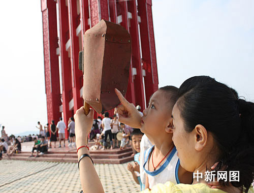 從21晚10時開始,陸續(xù)有民眾登上當(dāng)?shù)刂包c鳳凰山,等候日全食。22日7時許,記者在鳳凰山上山沿途看見數(shù)以萬計的民眾扶老攜幼,手持X光片、電焊防護鏡、黑色玻璃片、水盆等觀看工具,在鳳凰山上尋找最佳觀看位置。