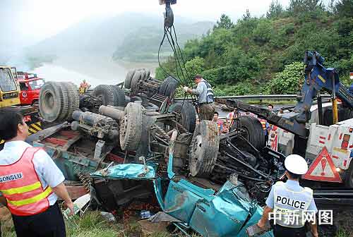 因大掛車四腳天,三名人員被死死的壓在了車內(nèi),而駕駛室已經(jīng)完全變形,消防官兵的救援器材根本派不上用途。指揮員馬上與現(xiàn)場的交警協(xié)商,利用交警大隊的大吊車將大掛車的車頭掉起。