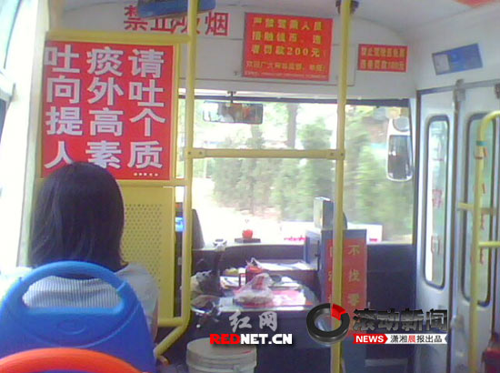帖中附有多幅圖片,皆拍攝于公交車前門靠駕駛室的位置,在司機臺后方,有幅標語煞是顯眼,紅底,粗體白字,上面寫著:吐痰請向外吐,提高個人素質(zhì)。車窗前頭有禁止吸煙,嚴禁駕駛?cè)藛T觸摸錢幣等標語,還有特有的黃色鐵桿,座位,都證實這是一個標準的公交車,發(fā)帖人稱此車系江蘇宿遷的公交車。
