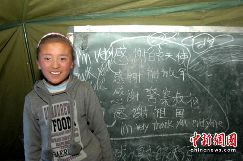 看到特警隊(duì)員們搭好了帳篷、送來(lái)了水果,第二完全小學(xué)的學(xué)生們眼含淚水,激動(dòng)地拍手感謝:“謝謝成都來(lái)的警察叔叔!”可愛的藏族小女孩文茂拿著粉筆在帳篷里的黑板上重重地寫下“感謝警察叔叔、感謝祖國(guó)、感謝你們每個(gè)人”。正在這里學(xué)習(xí)唱歌的十七、八個(gè)3、4年級(jí)的小學(xué)生也不約而同地為特警隊(duì)員表演了他們這兩天才學(xué)會(huì)的歌舞——“感恩的心,感謝著你……”同時(shí),成都特警支隊(duì)的隨隊(duì)醫(yī)生又和成都市第三人民醫(yī)院的醫(yī)生劉雁軍一起,開了“小診所”,為這里患病的學(xué)生進(jìn)行診治,還送上了藥品和飲用水。(完)