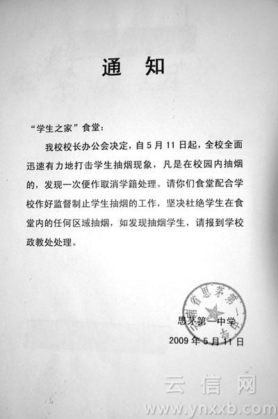 2010年6月1日,普洱市思茅區(qū)教育局向區(qū)屬23所校園發(fā)出《思茅區(qū)教育局關于在校園內公共場所禁煙的通知》(以下簡稱《通知》)!斑@是云南省第一家自發(fā)進行控煙工作的教育單位!痹颇鲜〗】到逃責熮k公室主任趙白帆說。