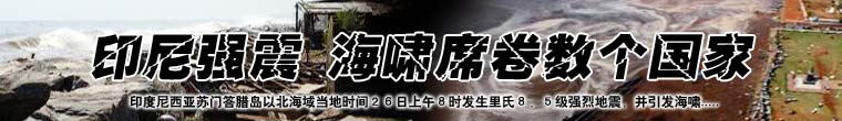印度尼西亞蘇門答臘島以北海域當(dāng)?shù)貢r(shí)間26日上午8時(shí)發(fā)生里氏8.5級(jí)強(qiáng)烈地震,并引發(fā)海嘯,東南亞和南亞數(shù)個(gè)國家受波及,造成重大人員傷亡。 |