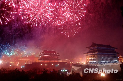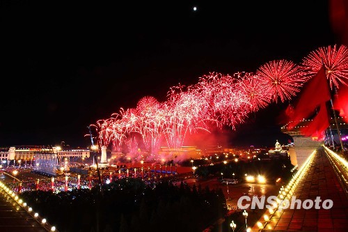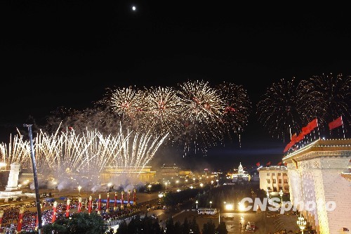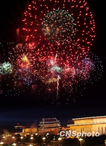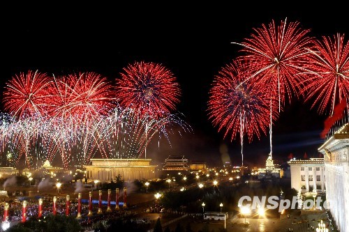 圖:天安門(mén)廣場(chǎng)上空璀璨的煙火