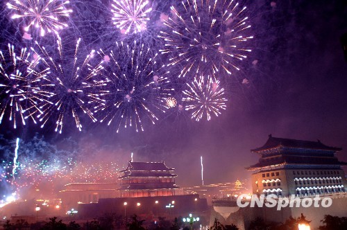圖:絢麗煙花在天安門(mén)廣場(chǎng)上空綻放