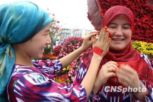 圖:新疆維吾爾族姐妹臉貼國(guó)旗裝
