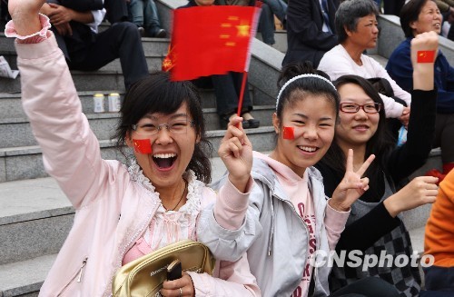 圖:黑龍江大學(xué)生揮舞國(guó)旗為祖國(guó)歡呼