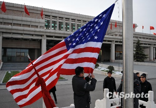 圖:中美國(guó)旗飄揚(yáng)歡迎奧巴馬訪華