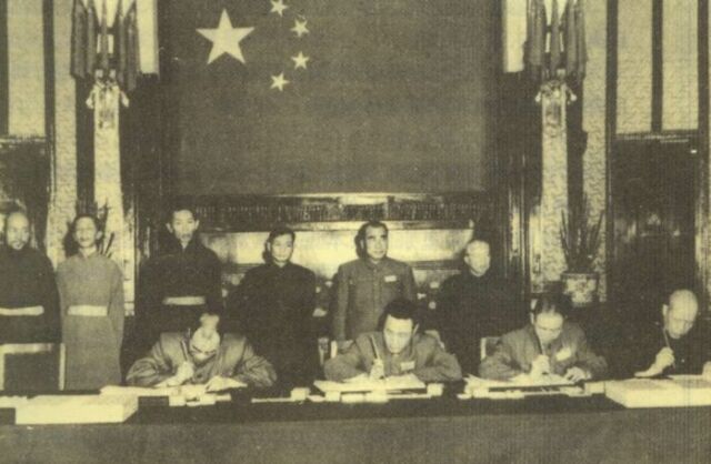 中央人民政府全權(quán)代表和西藏地方政府全權(quán)代表經(jīng)過談判之后,對和平解放西藏取得了一致的意見。一九五一年五月二十三日,《中央人民政府與西藏地方政府關(guān)于和平解放西藏辦法的協(xié)議》在北京正式簽訂。簽字儀式由中央人民政府副主席朱德、李濟深,中央人民政府政務(wù)院副總理陳云主持。