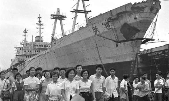 1958年11月27日,中國(guó)第一艘萬噸遠(yuǎn)洋貨輪“躍進(jìn)號(hào)”下水。這艘遠(yuǎn)洋貨輪由大連造船廠建造,使用當(dāng)時(shí)最新的技術(shù)裝備。它全長(zhǎng)169.9米,載貨量1.34萬噸,排水量為2.21萬噸,能在封凍的區(qū)域破冰航行。