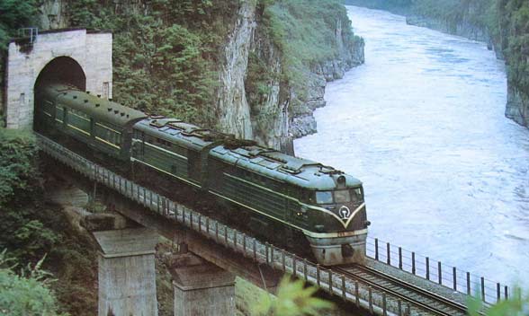 線路穿越大小涼山,有深二三百米的“一線天”峽谷。從金口河到埃岱58公里線路上有隧道44座。從甘洛到喜德120公里地段4次盤山繞行50公里,13次跨牛日河,真間有66公里隧道和10公里橋梁。過喜德后8次跨安寧河,在三堆子過金沙江。金沙江河谷是著我的斷裂帶地震區(qū),線路在河谷3次盤山,47次跨龍川江,然后南下至昆明。