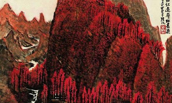 《萬(wàn)山紅遍層林盡染》是根據(jù)毛澤東詩(shī)詞《沁園春·長(zhǎng)沙》所作。李可染喜讀毛主席詩(shī)詞,并從那激越豪邁的詩(shī)里領(lǐng)略山水畫的境界。此畫是據(jù)“萬(wàn)山紅遍,層林盡染”句意再造了一個(gè)藝術(shù)世界,在黑紅對(duì)比中寫南國(guó)深秋景色,帶有理想化的詩(shī)意色彩。
