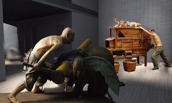 1964至1965年,四川省美術(shù)工作者在劉文彩收租院原址上創(chuàng)作并展出了大型泥塑《收租院》。這臺泥塑,藝術(shù)而生動地再現(xiàn)了舊中國以劉文彩為代表的地主階級對廣大農(nóng)民進行經(jīng)濟剝削和政治壓迫的真實情景。大型泥塑《收租院》由六組114個真人大小的泥像組成,依次表現(xiàn)了交租、驗租、過斗、算帳、逼租、反抗的情景。泥塑的人物形象生動,人物的性格、情感刻劃得十分深刻。114尊人像,個個栩栩如生,人物面貌、體態(tài)無一雷同。