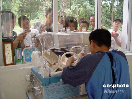 游客觀看震后出生的首對(duì)大熊貓雙胞胎寶寶