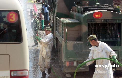 圖:北川災區(qū)為進出車輛實行嚴格消毒