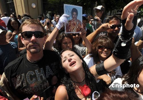圖:歌迷在追悼會(huì)場(chǎng)外共同悼念邁克爾·杰克遜