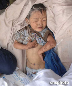 北川縣臨時醫(yī)療點內(nèi)的受傷兒童