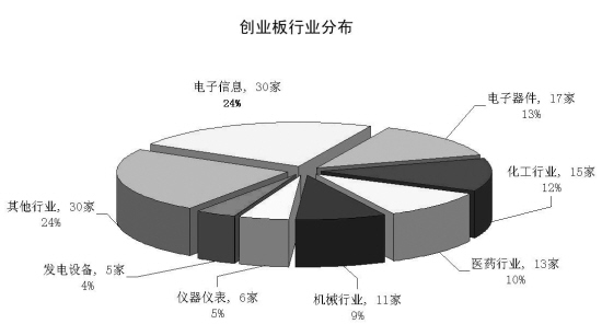 行業(yè)上看,創(chuàng)業(yè)板股共涉及23個行業(yè),其中電子信息股30只,占總數(shù)的24%,穩(wěn)居榜首;電子器件則有17只個股,占比13%緊隨其后。若加上儀器儀表、發(fā)電設(shè)備的11只個股,則泛電子類品種占創(chuàng)業(yè)板的比重將超過45%,今年4月30日上市的第11批創(chuàng)業(yè)板股,更全屬該行業(yè),顯示出其于國家大力扶持新興產(chǎn)業(yè)中的龍頭氣質(zhì)。同時,醫(yī)藥、化工、機械等行業(yè)亦有10家以上的創(chuàng)業(yè)板股;傳媒娛樂、環(huán)保行業(yè)則分別貢獻4只和3只個股。(圖2)