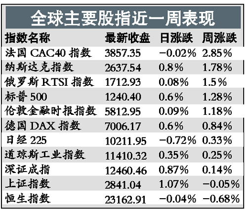 雖然中國(guó)A股近期萎靡不振,但其他多數(shù)股指表現(xiàn)搶眼,其中,受利好數(shù)據(jù)提振,美國(guó)道瓊斯指數(shù)上周五報(bào)收11410.32點(diǎn),上漲0.35%,且已經(jīng)實(shí)現(xiàn)連續(xù)兩周走高。其中,納斯達(dá)克收盤(pán)創(chuàng)下2007年12月以來(lái)的新高。而法國(guó)股市更是以2.85%的單周漲幅領(lǐng)漲全球股市。