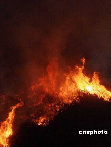 美國加州火災(zāi)最重的圣地亞哥,海軍陸戰(zhàn)隊大本營所在地的十月二十四日還在燃燒。連日肆虐的山火目前已造成至少十億美元的經(jīng)濟損失,近一百萬民眾被下令疏散到各個避難收容場所。布什總統(tǒng)將改在周五前往加州災(zāi)區(qū)視察。中新社發(fā) 賈國榮 攝