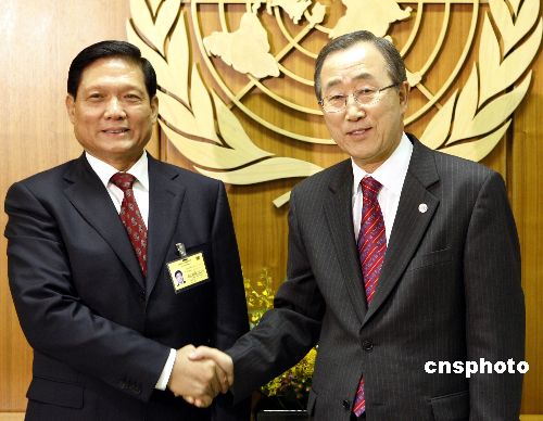 中共中央政治局委員、北京市委書記、北京奧組委主席劉淇三十一日在紐約聯(lián)合國總部與聯(lián)合國秘書長潘基文舉行會晤。中新社發(fā) 李靜 攝