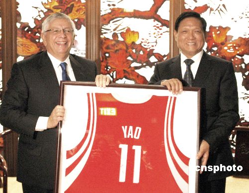 正在紐約出席聯合國大會的中共中央政治局委員、北京市委書記、北京奧組委主席劉淇,十一月一日會見美國職業(yè)籃球協會(NBA)總裁大衛(wèi)·斯特恩,斯特恩向劉淇贈送了姚明在NBA火箭隊的十一號球衣。中新社發(fā) 李靜 攝