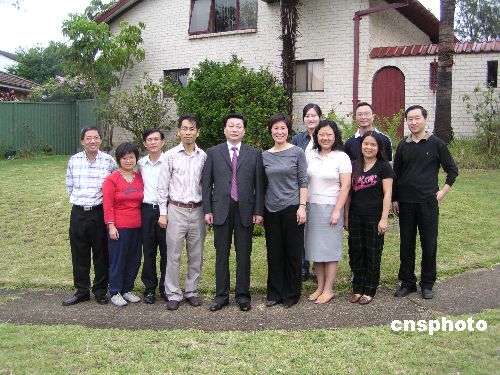 中國國務(wù)院僑務(wù)辦公室副主任馬儒沛(左五)三日在悉尼與風(fēng)華中文學(xué)校老師與家長代表座談后,與他們合影。中新社發(fā) 葛明 攝
