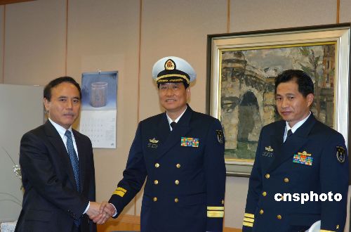 11月29日上午,正在日本進(jìn)行正式友好訪問的中國海軍軍艦訪日團(tuán)指揮員肖新年少將一行來到日本防務(wù)省,與日本軍界進(jìn)行交流活動。圖為肖新年少將(中)與日本防務(wù)省遷優(yōu)參事官(左)握手,訪日中國海軍導(dǎo)彈驅(qū)逐艦“深圳號”艦長朱建達(dá)上校(右)陪同會見。中新社發(fā) 滕劍峰 攝