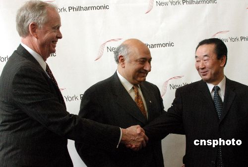 紐約當(dāng)?shù)貢r間十二月十一日,世界著名樂團紐約愛樂樂團正式宣布二00八年二月訪問朝鮮,在平壤舉辦音樂會。當(dāng)日,朝鮮常駐聯(lián)合國代表樸吉淵出席有關(guān)新聞發(fā)布會時表示,他深信此舉將有助于朝美之間加強文化關(guān)系,增進兩國人民的相互理解。圖為紐約愛樂樂團主席保羅‧庫恩達(左)、團長扎林·梅塔(中)和樸吉淵在發(fā)布會后握手互祝訪問成功。中新社發(fā) 李靜 攝